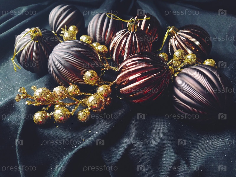 Открытка на новый год и рождество с украшениями, елочными украшениями и блестками на черном фоне. Коричневые блестящие полосатые шарики, цветы и белые снежинки, золотые веточки с ягодами