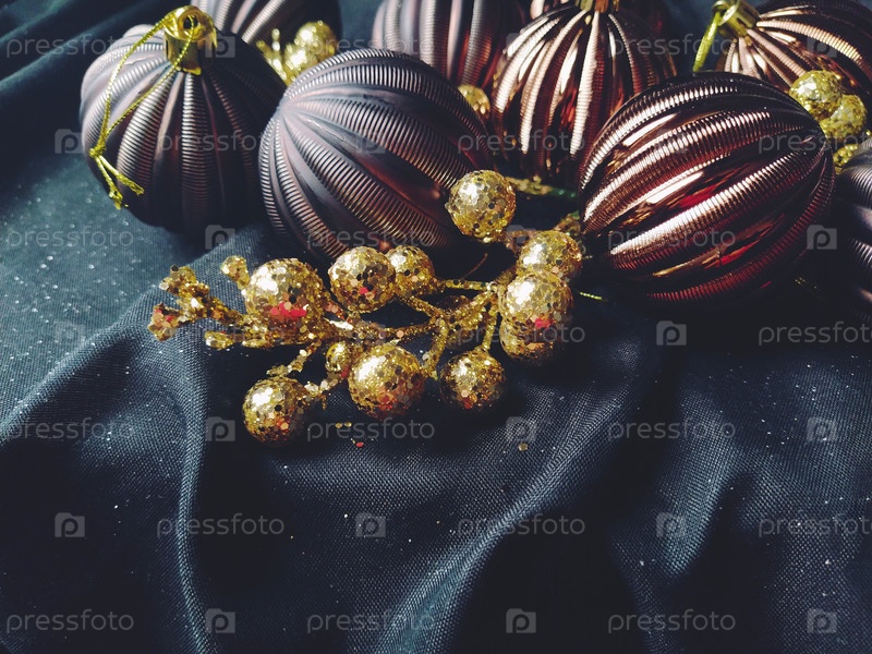 Открытка на новый год и рождество с украшениями, елочными украшениями и блестками на черном фоне. Коричневые блестящие полосатые шарики, цветы и белые снежинки, золотые веточки с ягодами
