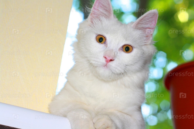 Белая кошечка с янтарными глазами розовыми ушками и носиком позирует на подоконнике