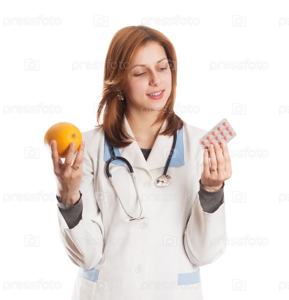 Доктор в медицинской форме делает выбор между натуральными витаминами и таблетками