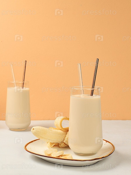 Банановое веганское альтернативное молоко без лактозы и глютена, без аллергии, концепция здорового питания, поддержание здоровой кишечной флоры, диетическое питание, потеря веса,