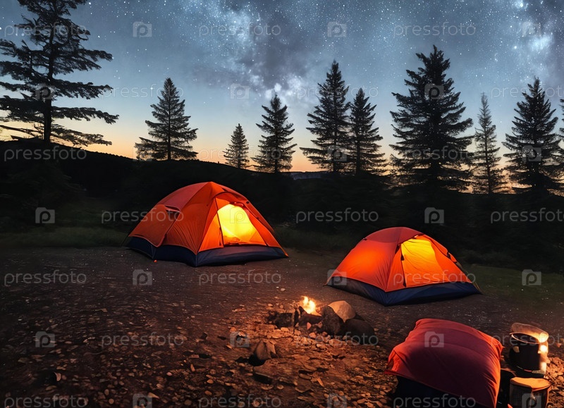Уют кемпинга. Устройте уютный кемпинг с палаткой, установленной под звездным ночным небом, освещенной теплым костром. Панорама