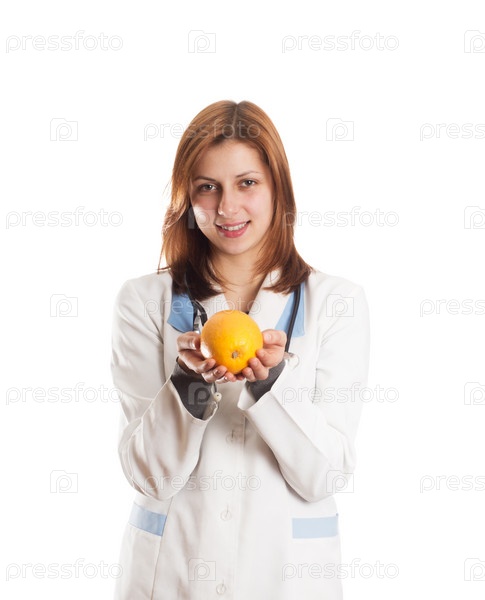 Доктор в медицинской форме держит в руках апельсин