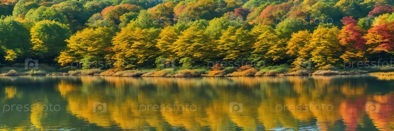 Красочная палитра осени с акцентом на спокойное озеро, отражающее яркую листву