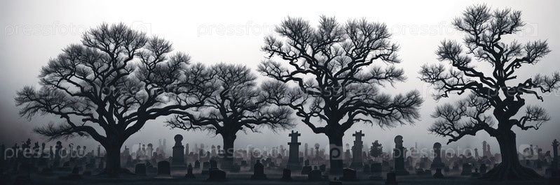 Кладбище, окутанное туманом, с обветренными надгробиями, стоящими на страже среди корявых деревьев, обращенных к луне