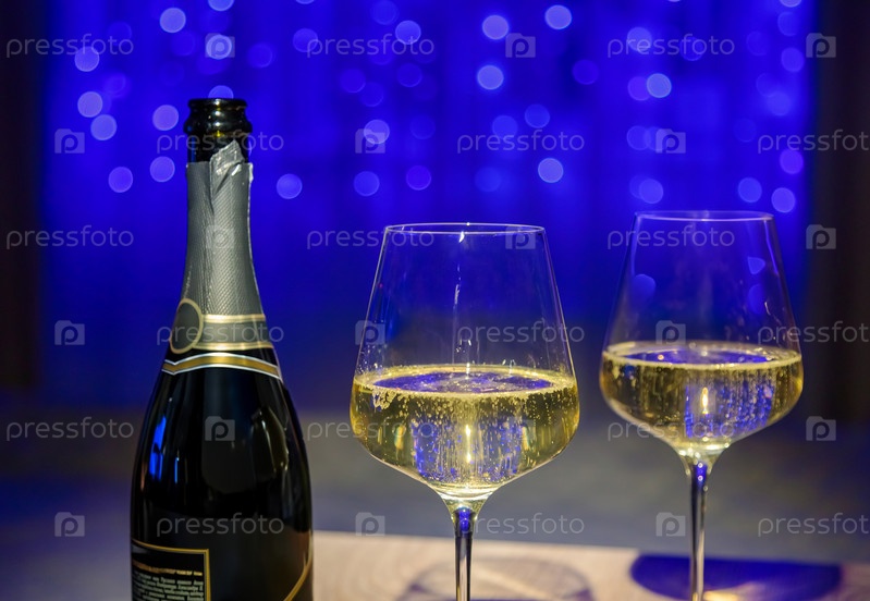 Бокалы шампанского и бутылка на фоне гирлянды, праздничное настроение