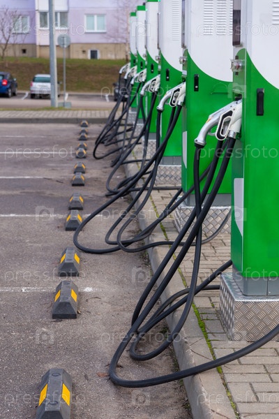 Парковка с зарядными станциями возле многоэтажного жилого дома