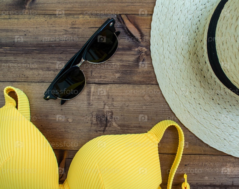 Летние каникулы, квартира. Шляпа, купальник и солнцезащитные очки на деревянном фоне