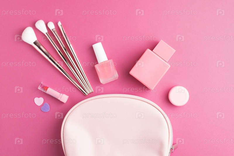 косметичка; косметика; сверху; стол; розовый; женский; красота; макияж; аксессуар; предмет; вид сверху; концептуальный; концепция; отдельный; духи; помада; лак для ногтей; фон