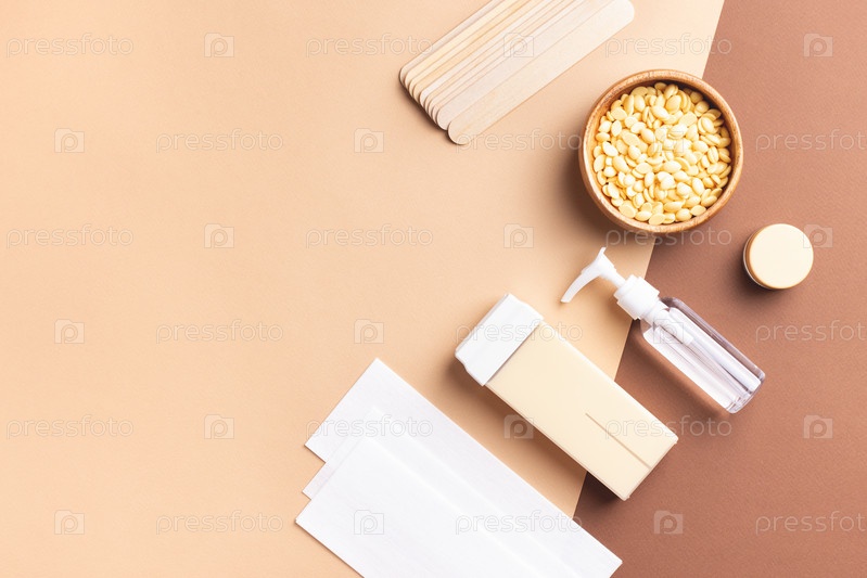 Вид сверху на инструменты для депиляции на бежевом фоне