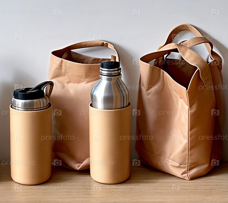 Устойчивый образ жизни. Продемонстрируйте устойчивый образ жизни с помощью композиции многоразовых экологически чистых продуктов, таких как бамбуковая зубная щетка, бутылка для воды из нержавеющей стали и холщовая большая сумка