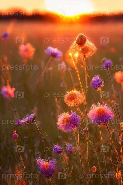 Золотой час сияния. Теплый, мягкий свет заходящего солнца освещает нежные полевые цветы или замысловатую паутину в поле, подчеркивая их естественную красоту