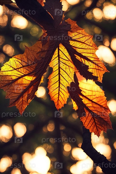 Лесные шепоты. Одинокий лист в темном лесу, сквозь крону которого просачивается заходящее солнце, подчеркивая сложные прожилки и текстуры в волшебной игре света и тени
