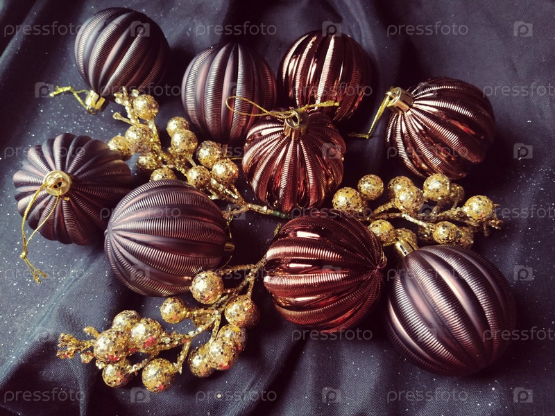 Открытка на новый год и рождество с украшениями, елочными украшениями и блестками на черном фоне. Коричневые блестящие полосатые шарики, цветы и белые снежинки, золотые веточки с ягодами