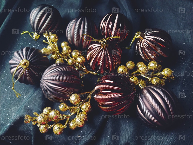 Открытка на новый год и рождество с украшениями, елочными украшениями и блестками на черном фоне. Коричневые блестящие полосатые шарики, цветы и белые снежинки, золотые веточки с ягодами