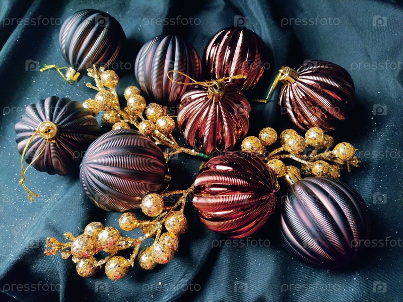 Открытка на новый год и рождество с украшениями, елочными украшениями и блестками на черном фоне. Коричневые блестящие полосатые шарики, цветы и белые снежинки, золотые веточки с ягодами