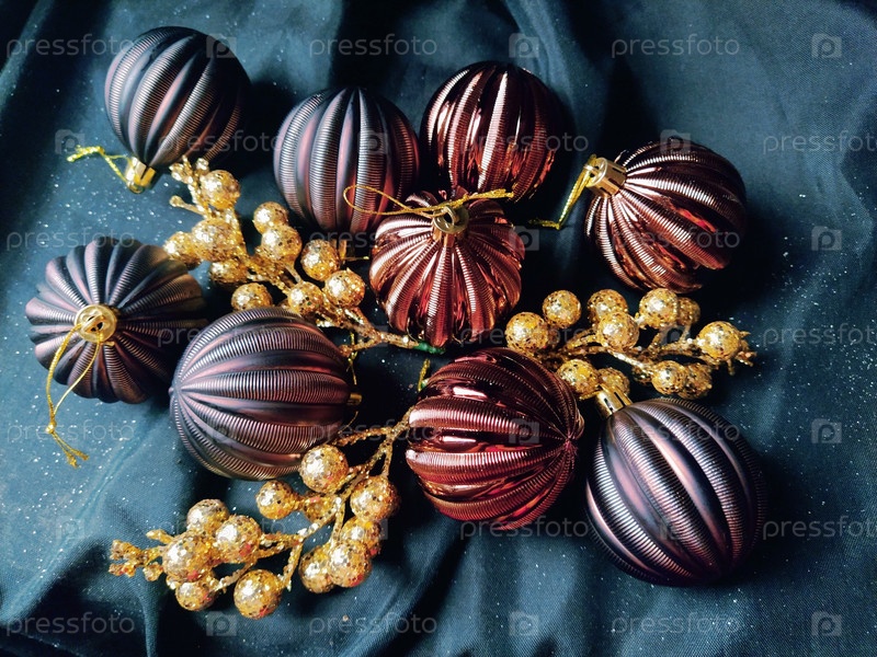 Открытка на новый год и рождество с украшениями, елочными украшениями и блестками на черном фоне. Коричневые блестящие полосатые шарики, цветы и белые снежинки, золотые веточки с ягодами