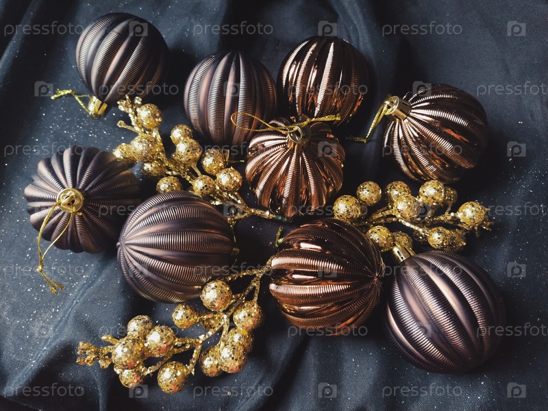 Открытка на новый год и рождество с украшениями, елочными украшениями и блестками на черном фоне. Коричневые блестящие полосатые шарики, цветы и белые снежинки, золотые веточки с ягодами