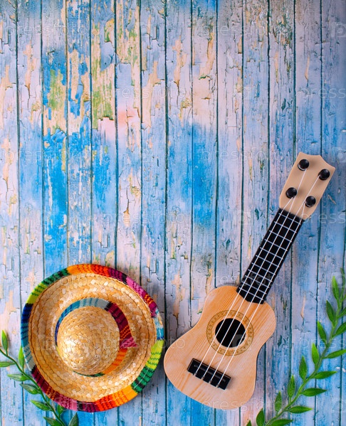 Мексиканская композиция с копировальным пространством. Гитара и шляпа сомбреро на синем фоне. Стереотипные атрибуты мексиканской культуры. Празднование Синко де Майо