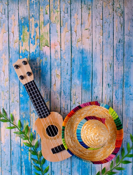 Мексиканская композиция с копировальным пространством. Гитара и шляпа сомбреро на синем фоне. Стереотипные атрибуты мексиканской культуры. Празднование Синко де Майо