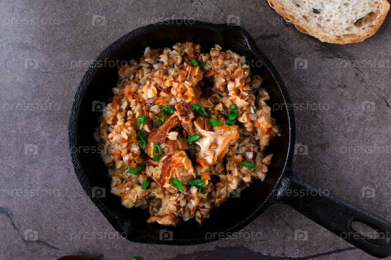 Мясо с гречкой подается в чугунной сковороде. Питательный обед или ужин. Вид сверху