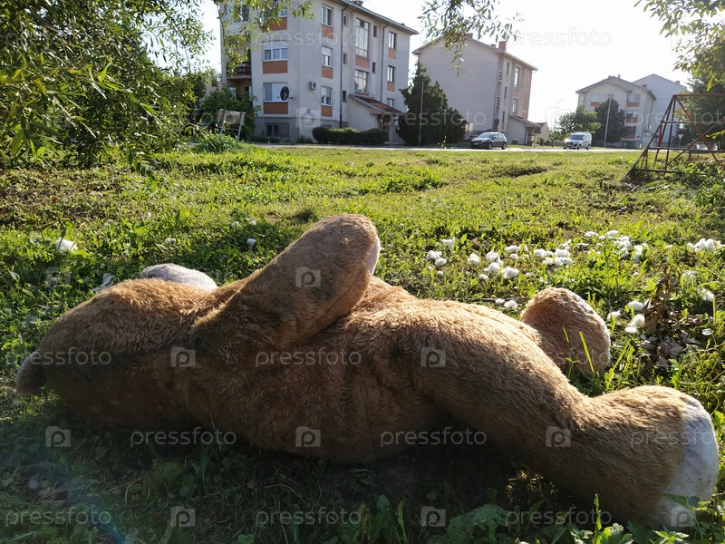 Ненужная забытая игрушка на траве. На земле лежит разорванный плюшевый мишка. Концепция насилия и забывчивости. Из груди медведя видна белая вата. Наполнитель вокруг игрушки