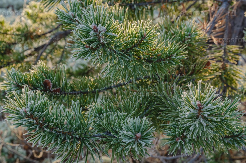 Ветви ели с зеленой жижей, покрытые влагами, на фоне мха северной тундры. Осенний природный натюрморт полярной флоры. Яркая палитра осенней сибирской тундры