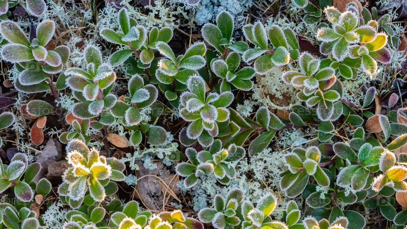 Листья растений северной тундры покрываются в начале зимы. Разноцветная флора полярных регионов земли. Живописная природная красота осенней тундры