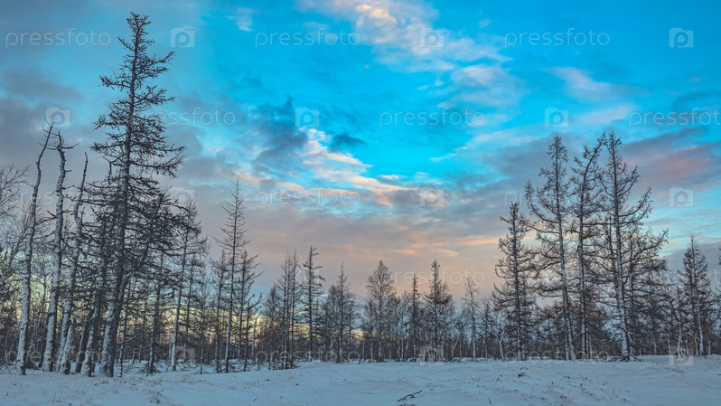Зимний природный ландшафт северной лесотундры Сибири. Деревья стоят черными силуэтами без листвы. Снег покрыл землю и мох между деревьями. Красивое текстурированное небо перед закатом