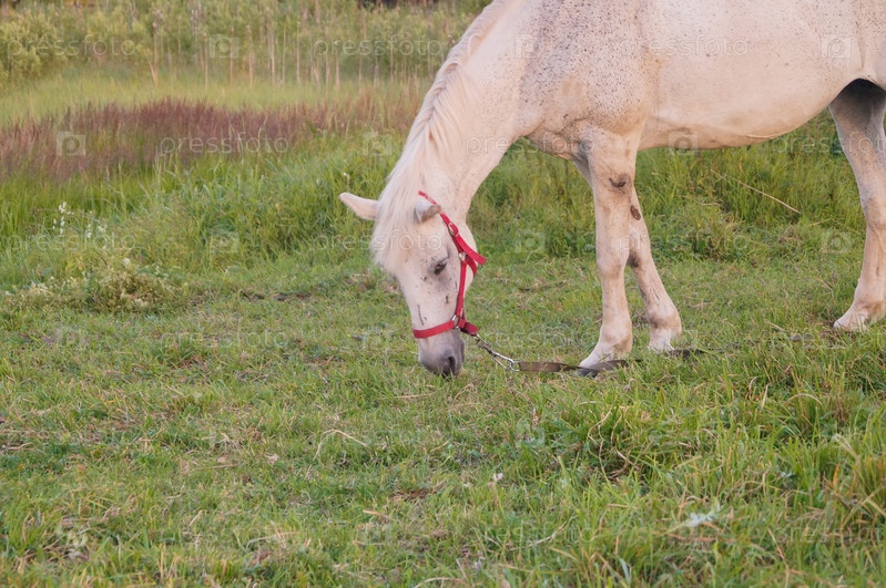 Красивая белая лошадь кормится на зеленом пастбище