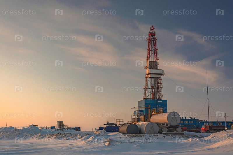 Общий вид буровой установки для бурения скважин на нефтегазовом месторождении в Арктическом регионе. Зима. День. Буровое оборудование и техническая инфраструктура