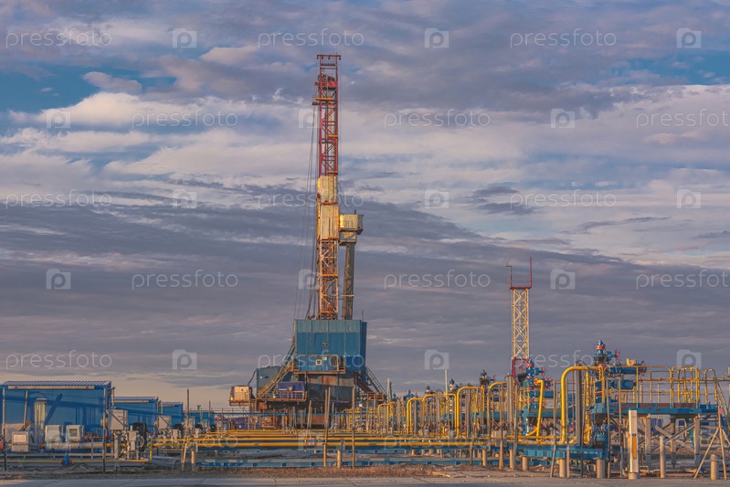 Скважины, добывающие природный газ на месторождении в Арктике. Фонтанное оборудование и технологическая обвязка группы скважин для добычи газа. На заднем плане буровая установка. Красивое небо