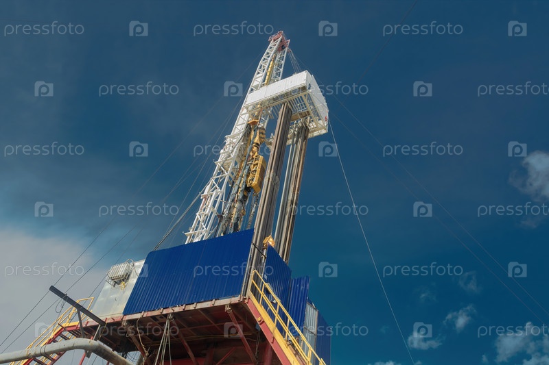 Буровая установка для бурения скважин на нефть и газ. Общий детальный вид. Вид сбоку снизу вверх. На фоне прекрасного неба. Буровая вышка на основании и бурильные трубы для спуска в скважину