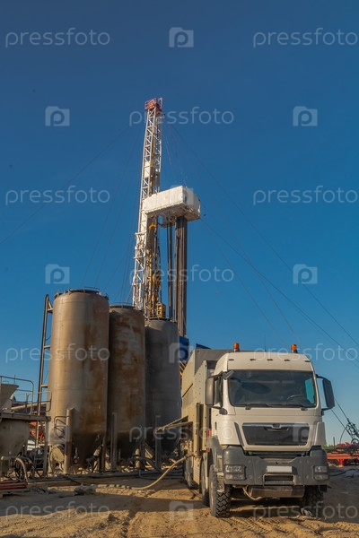 Буровая установка с оборудованием для цементирования скважин на переднем плане. Видна инфраструктура, средства связи и буровое оборудование. Цементировочный агрегат на автомобильном шасси. Резервуары для хранения цемента