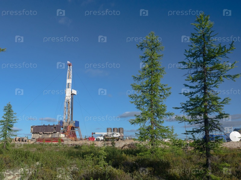 Пейзаж с буровой установкой на месторождении нефти и газа. Видна инфраструктура, средства связи и буровое оборудование. Вокруг буровой установки летняя северная тайга с зелеными деревьями и голубым небом