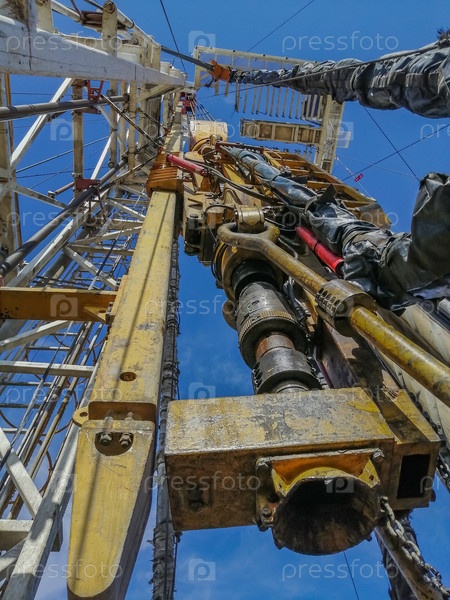 Вид на буровую установку изнутри вверх. Стальные бурильные трубы стоят. Верхний силовой привод перемещается по вышке на передвижной системе