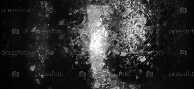 Рельефный стеклянный фон. Гофрированное стекло монохромное. Преломление света на ухабистой прозрачной поверхности под подсветкой. Игра белых и серых бликов. Черные области. Абстрактный фон