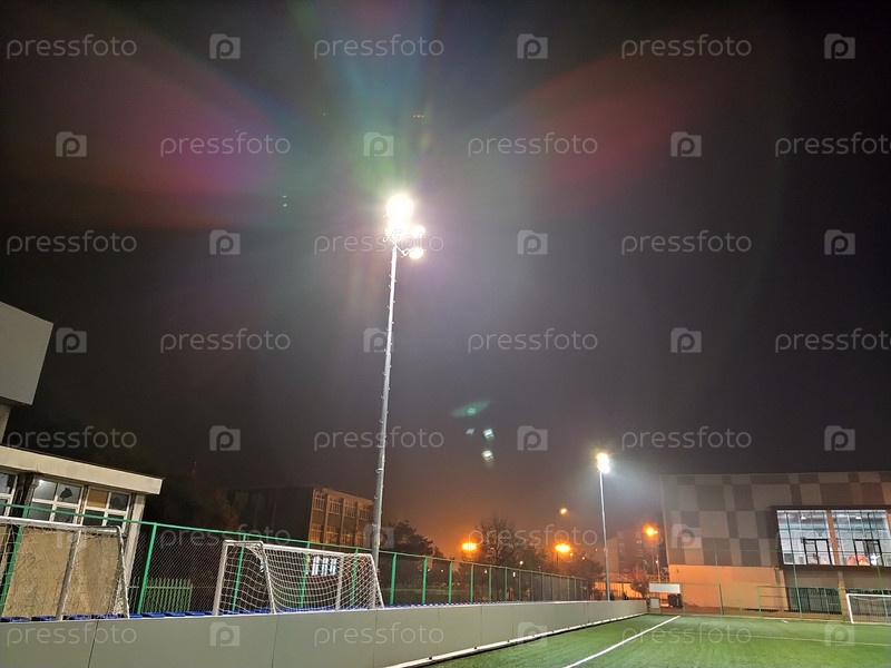 Белград, Сербия, 29 октября 2020 г. Стадион в огнях и вспышках. Пустое красивое футбольное поле со светящимися прожекторами вечером или ночью. Искусственный газон. Эффект тумана или дыма. Футбольные ворота