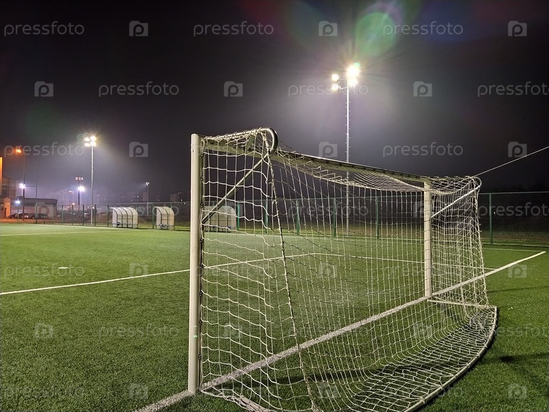 Стадион в огнях и вспышках. Пустое красивое футбольное поле со светящимися прожекторами вечером или ночью. Искусственный газон. Эффект тумана или дыма. Футбольные ворота