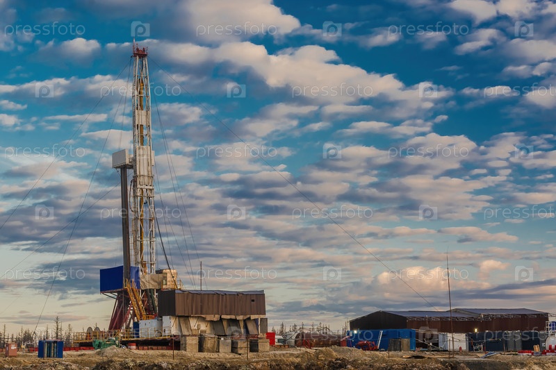 Участок в северной тундре на нефтегазовом месторождении. Буровая установка для бурения скважин. Инфраструктура и буровое оборудование для проведения буровых работ. Красивое выразительное небо