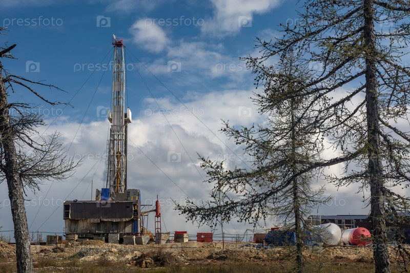 Природный ландшафт северного нефтегазового месторождения с буровой установкой для бурения глубоких скважин. Весенний хвойный лес, голубое облачное небо