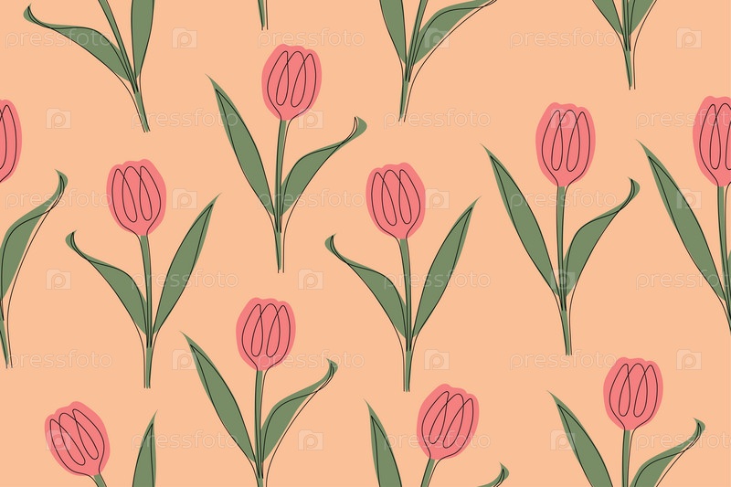 Бесшовный узор из тюльпанов на розовом фоне. Ручной рисунок, весенние цветы для ткани, принты, украшения, пригласительные открытки. Векторная иллюстрация