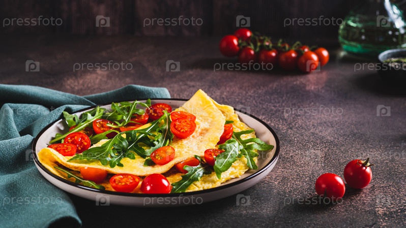 Французский омлет с начинкой из помидоров черри и рукколы на тарелке на столе веб-баннер