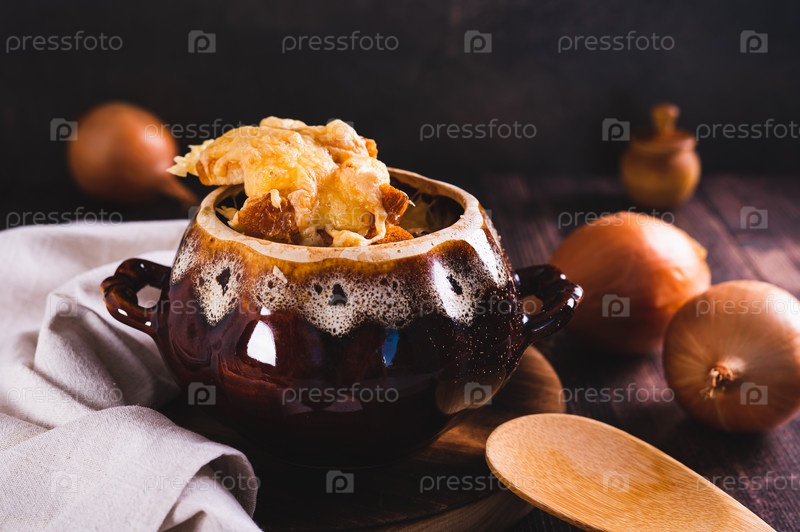 Французский луковый суп с плавленым сыром и гренками в кастрюле на столе