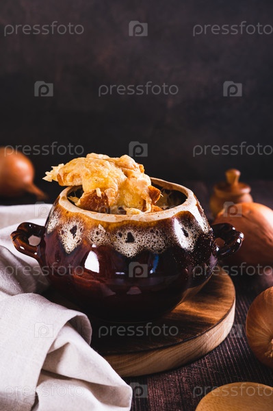 Французский луковый суп с плавленым сыром и гренками в кастрюле на столе, вертикальный вид