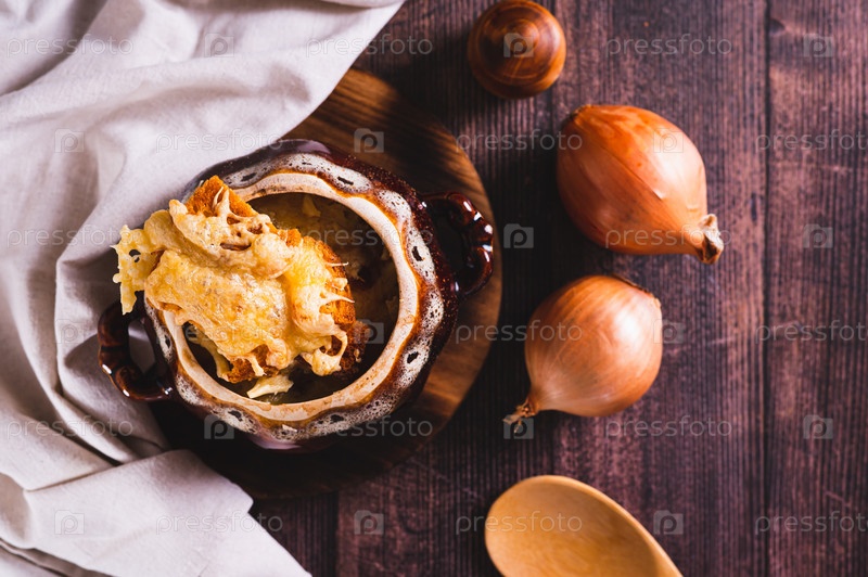 Французский луковый суп с плавленым сыром и гренками в кастрюле на столе, вид