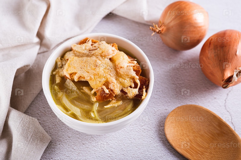 Французский луковый суп с запеченным сырным хлебом в миске на столе