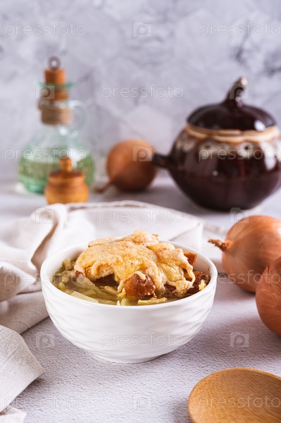 Домашний луковый суп с гренками и сыром в миске на столе, вертикальный вид