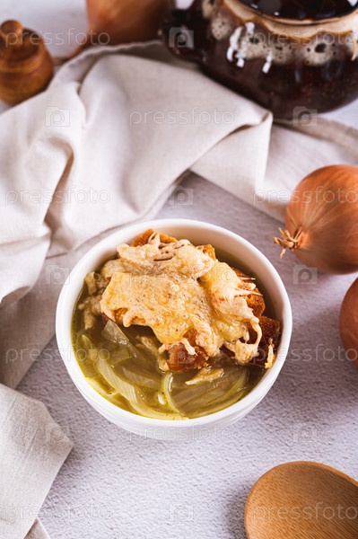 Французский луковый суп с запеченным сырным хлебом в миске на столе, вертикальный вид
