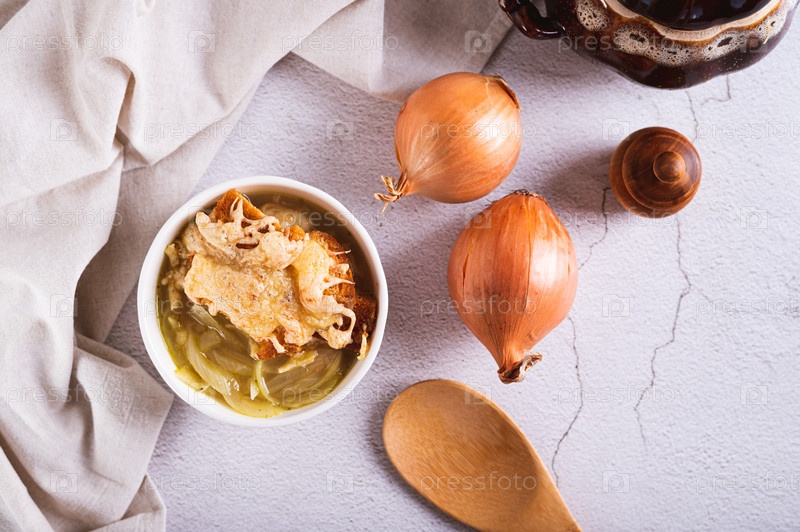 Домашний луковый суп с гренками и сыром в миске на столе, вид сверху